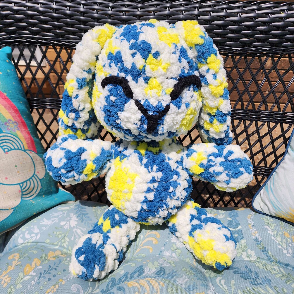This guy is about 22" tall, not including ears. Made with extra bulky blanket yarn, this lil guy is super soft and plush! Perfect for snuggling, hugging, hanging out, or just display.